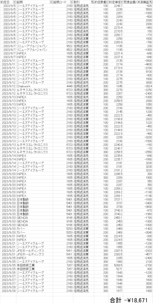 2023年9月結果-18,671円 デイトレ Twitter Facebook はてブ Pocket LINE コピー 2023.09.302023.10.10 人生初の1ヵ月のデイトレ結果。 10月は大きく負ける日を減らしてプラスにするぞ。